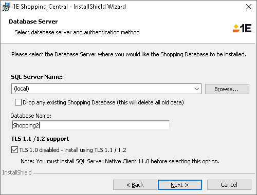 The name of the SQL Server instance to host the Shopping database. Checks are made to see if the machine is an SQL Server. You have the option to drop any existing Shopping database.