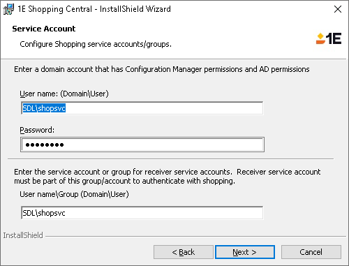 Set this to the user name of the account you want to use for running the 1E Instruction that implements the Client-side Order Tracking feature and any 1E Instructions you are making available as Shopping applications. The user name must be provided in the form of Domain\User. You could even set this to the account details you used for the Shopping Service account to avoid having to provision another account.
