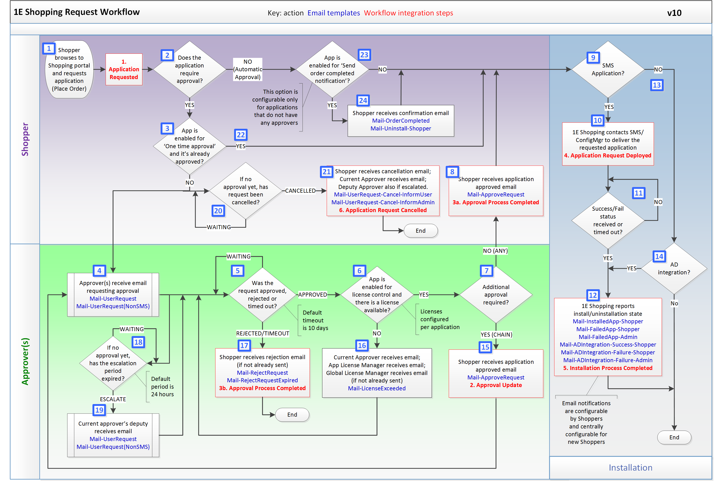 Shopping relies on the use of email notifications to manage approvals and licensing. The default email content can be modified by editing the template XSLT files in: C:\Program Files\1E\Shopping\Website\ShoppingAPI\GlobalResources]