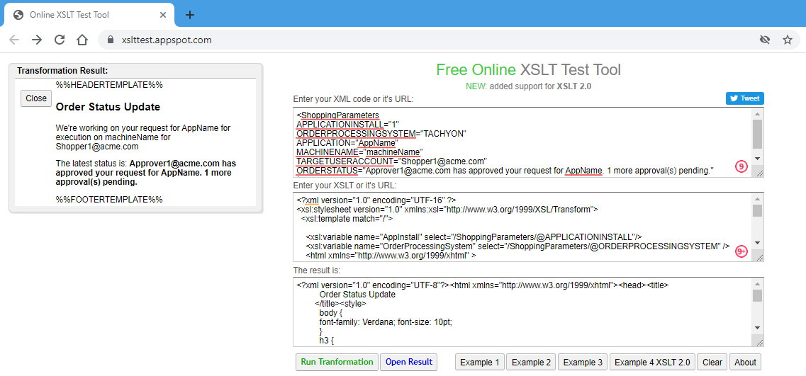 The following example is for Mail-OrderStatus-Shopper.xslt (refer to action 2 in Action meanings):