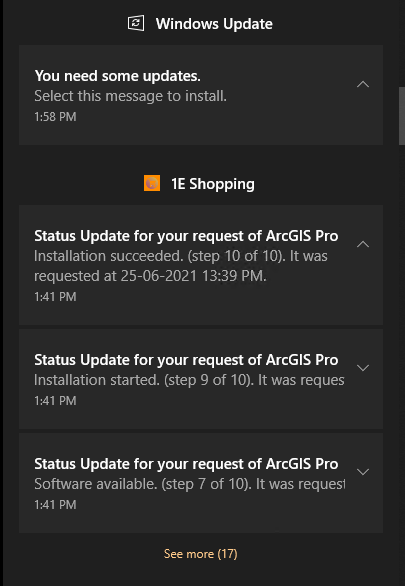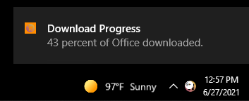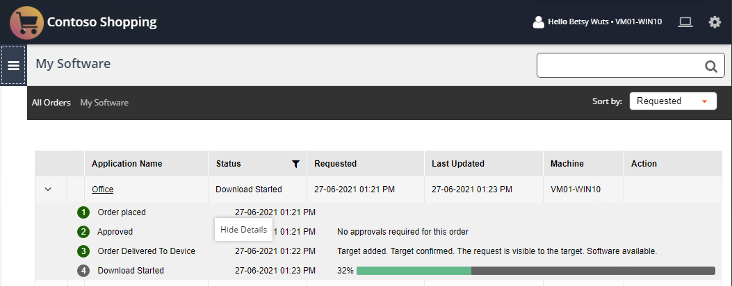 The content for the ConfigMgr application is still downloading - a percentage is indicated. This action (and 22 Delay) is special because progress is monitored locally by the Shopping Client, and not dependent on ConfigMgr client sending status to the Site, the Site processing it, and then being polled and reported by Shopping. Shopping Client will update the icon and toast notification(s) itself based on which notifications are required and their text format, determined at the point when the Shopper made the request. Shopping Central will send the Order Status email when it receives a status from the client. |