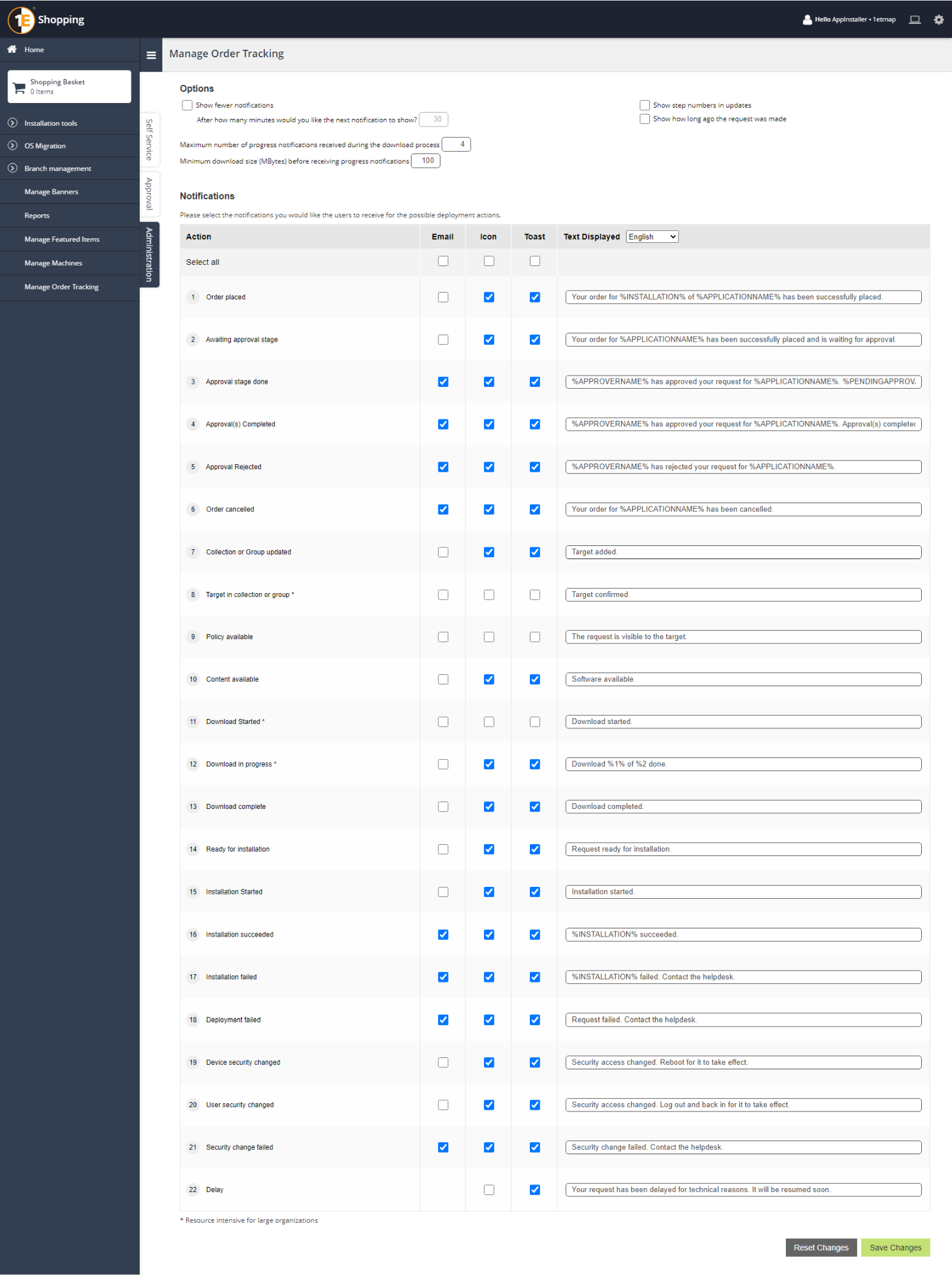 The email Order Tracking feature works with or without enabling the 1E Platform integration and provides additional control over the some of the normal request workflow emails. A list of all emails and an overview of the normal request workflow is provided in Editing or localizing Shopping and The Shopping workflow. Order Tracking options do not affect normal request workflow Approval emails.