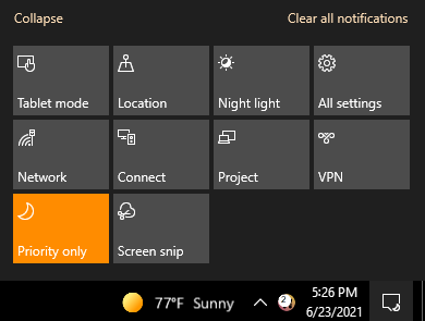 Click the Focus Assist tile. The tile will indicate that only priority notifications will be shown. The action center icon will include a moon