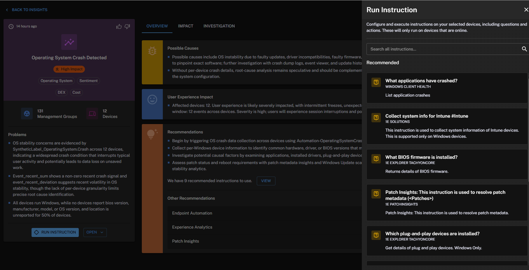 To view Insight details, click an Insight on the Insights dashboard. You can see the description of the problem identified, potential causes, user impact assessment, recommendations, and remediation guidance on what to do next. This also includes access to data driving the insight and a device list.