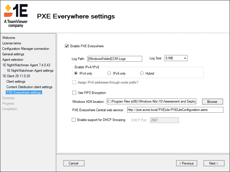 Check this to ensure that PXE Everywhere is FIPS compliant in its communications. This is only available from PXE Everywhere 3.0 and later. You must use the same FIPS setting on all PXE Everywhere Agents and PXE Everywhere Static Responders. Please ensure you use the same setting if you have previously deployed PXE Everywhere, unless you are sure you want to change it. |