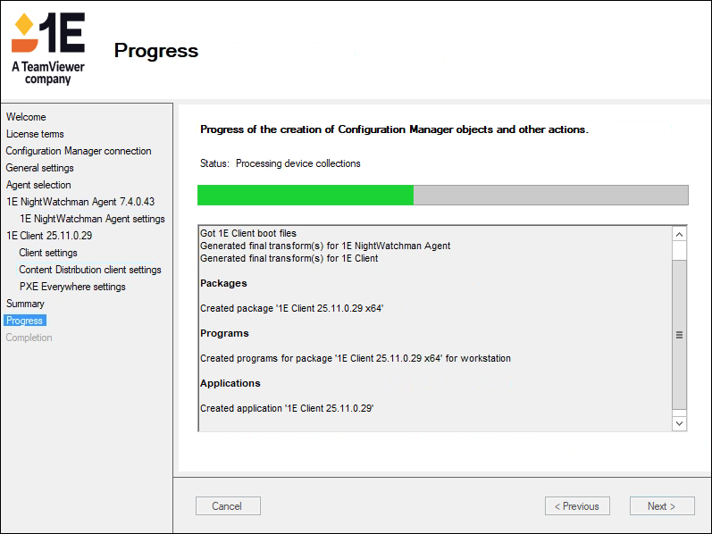 A screen is displayed to show the progress. There may be a slight delay before the progress bar starts as background processing takes place. Click Next when all the actions are complete.
