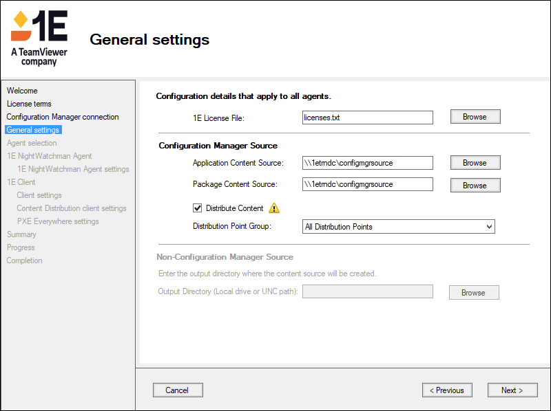 Enter the UNC of the Configuration Manager Application Content Source share where the wizard saves content source for use by Configuration Manager applications. The wizard will create 1E folders below it. For example, your applications UNC may be: \\acme-server\dsl$\Applications. |