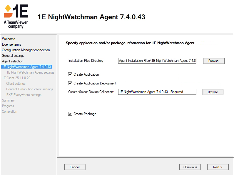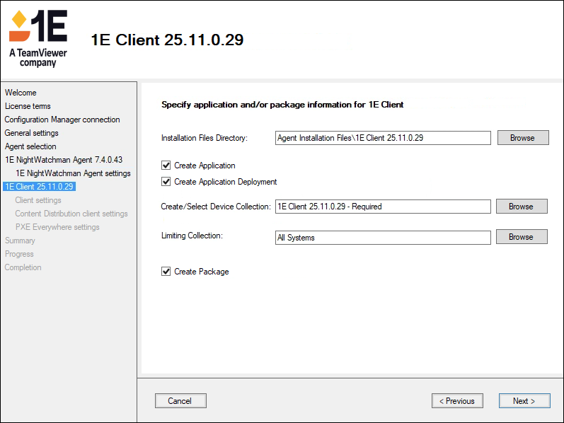 Determines if an application for the client is created in Configuration Manager. You must check Create Application and/or Create Package option to enable and click on the Next button. If this option is not checked, then the CDA Wizard will not copy files and create an MST transform in the Application Content Source specified in the General settings screen. |