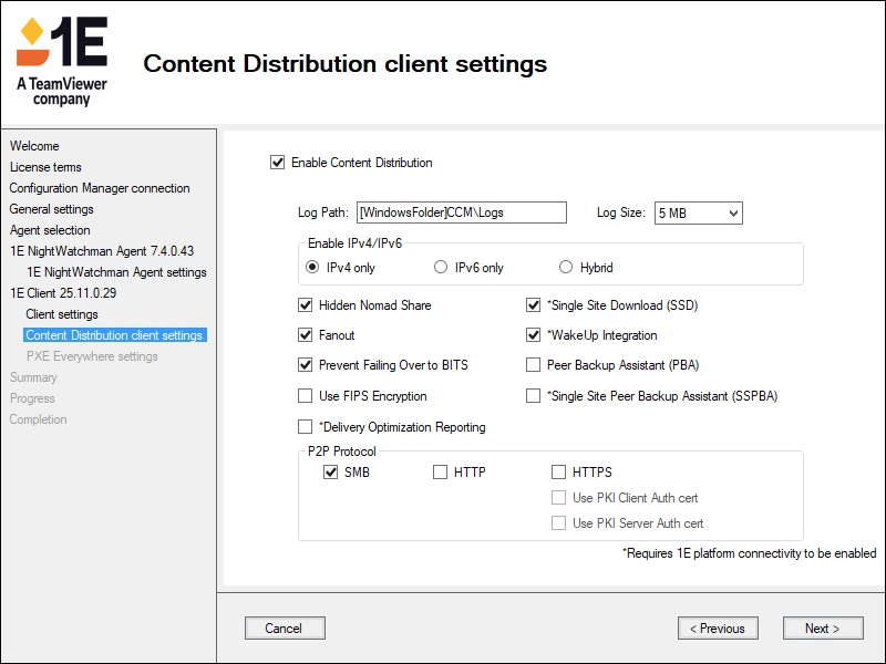 Check this to ensure that Content Distribution is FIPS compliant in its communications. You must use the same FIPS setting on all Content Distribution clients. Please ensure you use the same setting if you have previously deployed Content Distribution Branch or 1E Client with Content Distribution client module enabled, unless you are sure you want to change it. |