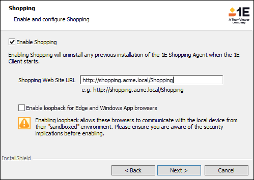 Shopping must be enabled so that users of a computer can use the 1E Shopping self-service portal, the Windows Servicing Assistant, and the 1E Virtual Assistant. If enabled, when the 1E Client starts it will attempt to automatically remove any previous installations of the 1E Shopping Agent. |