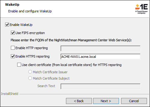 If enabled, then all components in the NightWatchman and WakeUp system must have FIPS enabled. EncryptionLevel and FIPS settings used by WakeUp do not affect other 1E Client communications. |