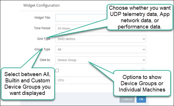 Device Groups can be used in the Service Watch Desktop, App Network dashboards, and individual widgets.