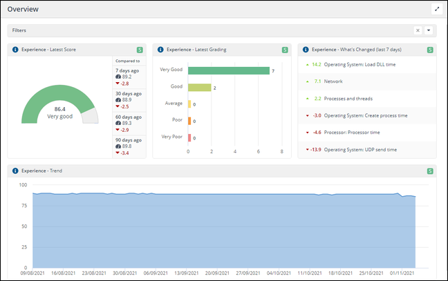 To start their day, the EUC manager loads up their Experience application and looks at the Overview page. Here they check the latest Experience score to see how their network is doing overall right now. The score of 86.4 is looking good, but is there anything more they can do to improve service? Checking the Compared to section of the Experience Latest Score tile, they can see that in general the Latest Score is moderately down against the results from 7, 30, 60 and 90 days ago. The EUC manager is interested in how the scores changed, particularly if the scores are decreasing - since this may be indicative of a problem that needs action.