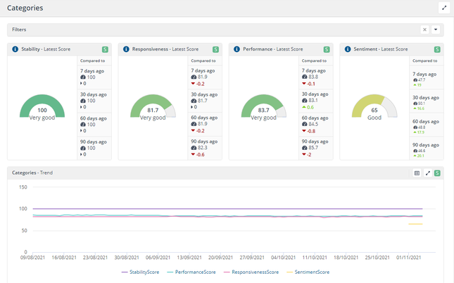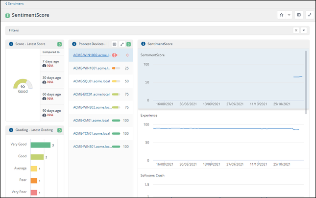 Clicking on the Experience - Latest Score tile drills down to display the constituent scores on the Categories page. Here the EUC manager checks the Stability, Responsiveness, Performance and Sentiment scores. Scanning across, the Sentiment - Latest Score of 65 is good, but lower than the others. The comparisons with 7, 30, 60 and 90 days ago shows there has been an overall improvement - but the fact that the score is the lowest, is there still an issue that may be affecting end-user sentiment?