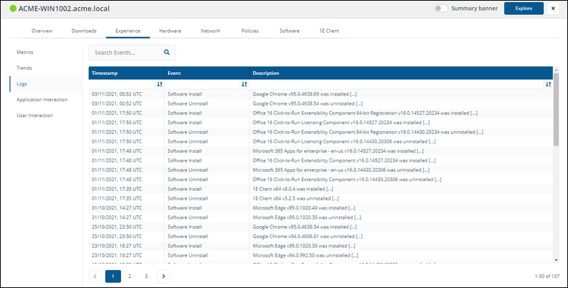 When navigating from the Poorest Devices tile, Device Details initially opens on the Logs panel, as seen in the picture. Here, the EUC manager can view information about the device that is retrieved from the device logs.