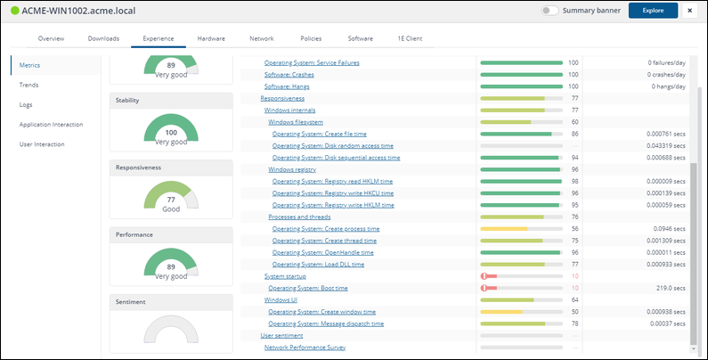 Clicking on the Metrics table the EUC manager scrolls down and sees that there are issues reported for the device related to the System startup, specifically the Operating System Boot time - where the score is only 10. They can also see that this is affecting the User sentiment for the device. At this point they could click the Explore button and investigate the issue further using 1E Platform real-time system, or assign the task to one of their IT team. Whichever they choose, they are now ready to take action.