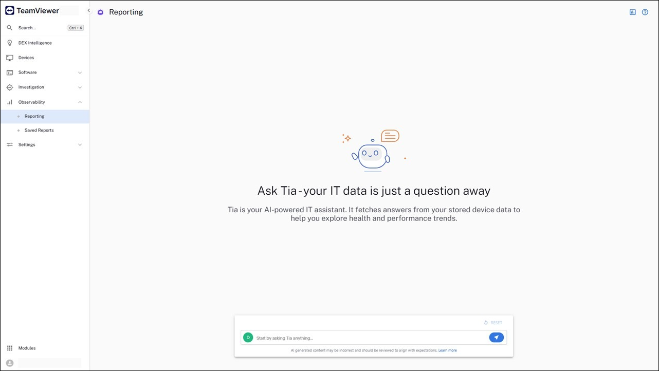 While the initial rollout is limited to Enterprise+ customers, Tia Reporting is planned for availability in TeamViewer One Enterprise and DEX Enterprise license tiers in a future release.