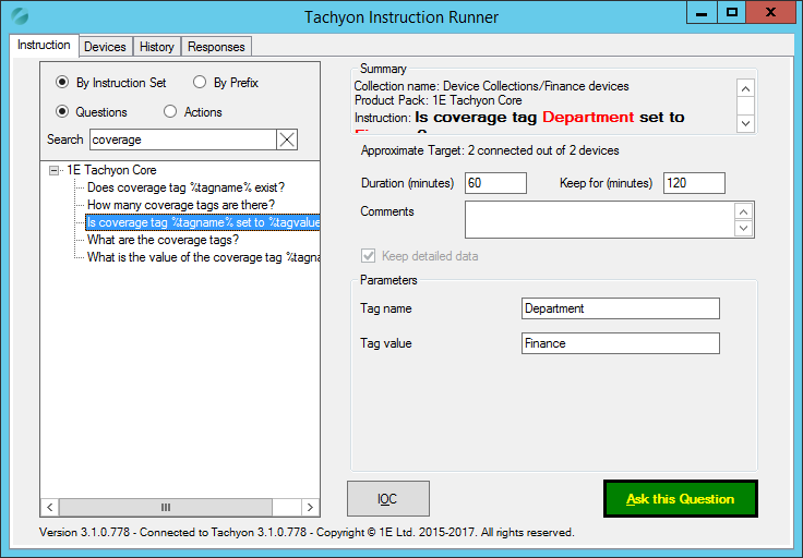 As an example, we're going to run an action to determine whether the Finance department devices all have the correct coverage tag set by 1E.