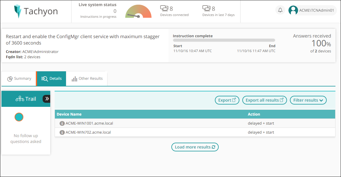 Following the normal approval process the action gets run on the 1E client devices. In the case of this action the time at which the Configuration Manager Client Service is started is subject to a random delay with a maximum of 3600 seconds. This is to prevent the Configuration Manager encountering problems through large numbers of client services attempting to contact it at the same time. This will mean that you may have to wait for an hour for the clients to be available to Configuration Manager again.