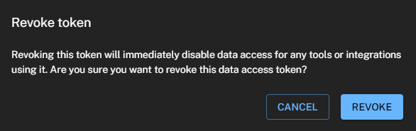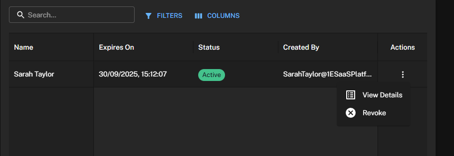 Platform administrators can create tokens and revoke tokens on demand. The token list is searchable and filterable.