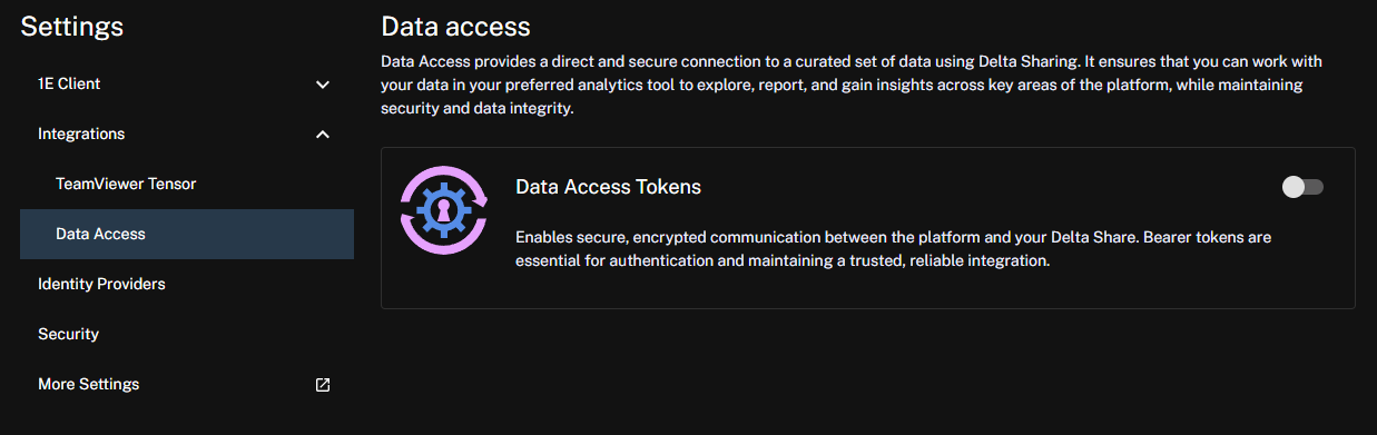 Data Access enables you to securely connect your own analytics tools to 1E data using Databricks Delta Sharing. This gives you direct access to selected datasets from the DEX Platform, allowing you to build custom reports, dashboards, and insights using tools like Power BI, Tableau, or Databricks. These datasets are designed to help you explore performance, usage, and user experience across your environment. All data is read-only and shared according to your tenant’s permissions.
