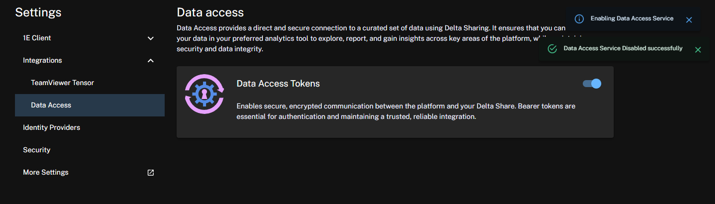 Data Access is available from Settings > Integrations > Data Access in the new Platform UI. The feature can be toggled on or off.