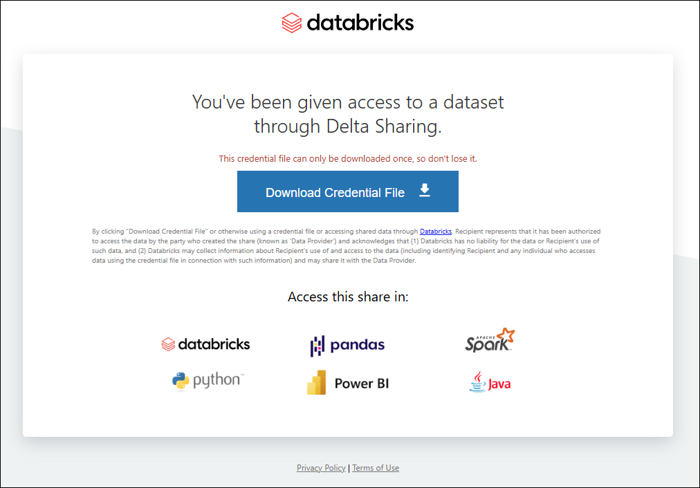 You can use the Databricks link to download the data file for use in tools like PowerBI. Refer to Databricks Delta Sharing.