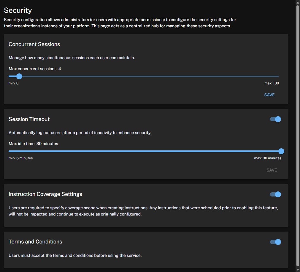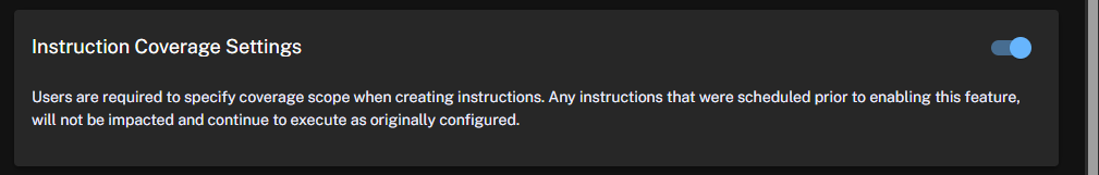 Admin can set Instruction Coverage to prevent unintended instructions from being executed on devices. If enabled, the platform requires that every instruction has a defined scope or coverage before it can be sent for execution. Disabling this feature allows instructions without coverage to be sent. This setting is disabled by default.