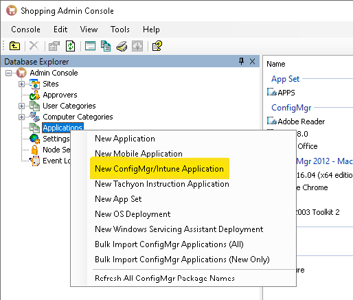For an Intune application to be made available in Shopping, it needs to be linked to a Shopping application by creating it in the Shopping Admin Console. The new Intune application can be created in Shopping Admin Console as shown below: