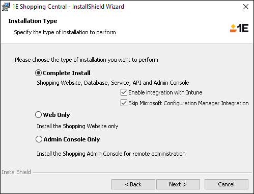 Early in the Shopping Central installation wizard, when you specify the installation type you can indicate whether Intune integration should be enabled. You can use Shopping with Microsoft Intune in much the same way as with Configuration Manager. You can do this by checking Enable integration with Intune. Refer to Microsoft Intune integration for details on how to: